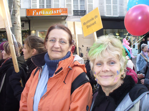 Nous sommes arrivés un peu en retard… « Paris et ses embouteillages » mais nous avons tout de même pu être au départ à l’hôpital Broussais et retrouver Marie-Claude BOITEUX, son mari ainsi que Cécile (Cutis Laxa) qui avaient gentiment pris notre panneau. Comme l’année dernière notre marche fut portée par l’énergie de l’espoir. Tout en bravant la pluie et le vent, nous étions tous unis dans un même combat… Plus de 2000 marcheurs …Les maladies sont rares mais les malades sont nombreux et parfois des échanges de brochures et quelques mots pendant cette marche font naître des amitiés. J’ai longtemps marché auprès d’un couple qui se battent pour faire effectuer des recherches sur le syndrome d’Alström, nous nous étions rencontrés pendant le colloque sur les maladies génétiques rares de l’œil et nous avions sympathisé ! Puis Florence étant trop fatiguée nous sommes allées dans le bus que la RATP met à disposition des personnes ne pouvant effectuer toute la marche où simplement pour un moment de repos. Puis je suis restée en fin de marche où j’ai fait la connaissance d’un couple de Valence et depuis une très grande amitié est née ! Avec Rémy nous avions évidemment parlé de nos problèmes respectifs, il poussait le fauteuil roulant de sa femme. Il m’a donné une carte de visite et moi une brochure et nous nous sommes contactés dès notre retour. Claudine est atteinte de la maladie de TARLOV et même si elle est souvent très fatiguée, elle est pleine de joie de vivre et très à l’écoute des autres, des personnes comme on aimerait en trouver souvent sur sa route. Tout au long des 8 kilomètres de la marche à scander nos slogans « Abandon, non, non, non…Optimisme, oui, oui, oui…c’est l’espoir qui nous fait marcher » les passants nous applaudissaient, d’autres à leurs fenêtres, nous saluaient.